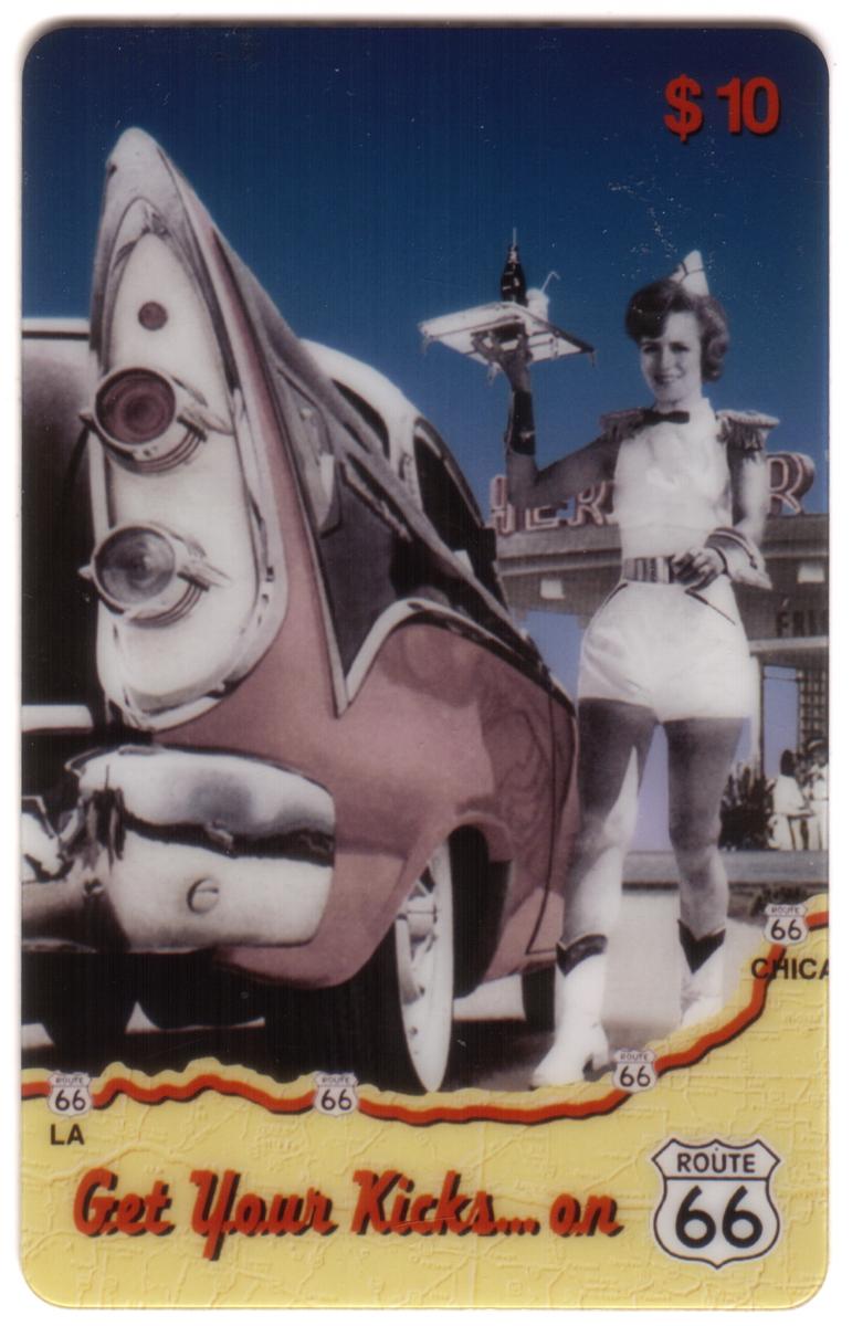 This item is a collectible card issued by LDDS WorldCom, linked to automotive nostalgia and food service themes, particularly carhops. The visual and textual elements combine to celebrate the iconic American experience of Route 66 travel and the era of drive-in diners with carhops serving customers directly at their vehicles.
