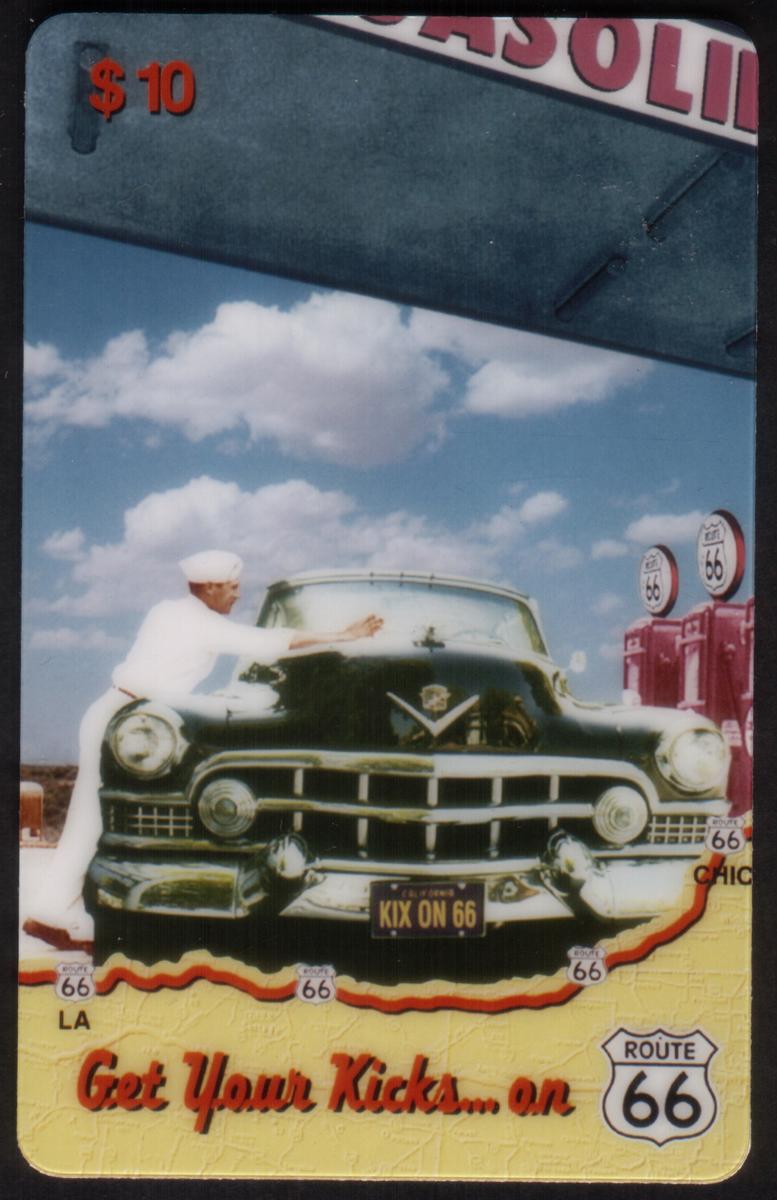 The overall composition celebrates the heritage of Route 66 and the golden era of car travel, capturing the essence of American automotive history and classic gas station service. The card is part of a collectible series commemorating classic cars and Americana, with specific focus on automotive culture and transportation along Route 66.