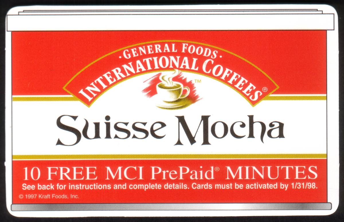 This laminated paper card serves as a promotional phone card for use with MCI Communications, providing prepaid calling minutes as part of a corporate promotion by General Foods to advertise their Suisse Mocha coffee product.