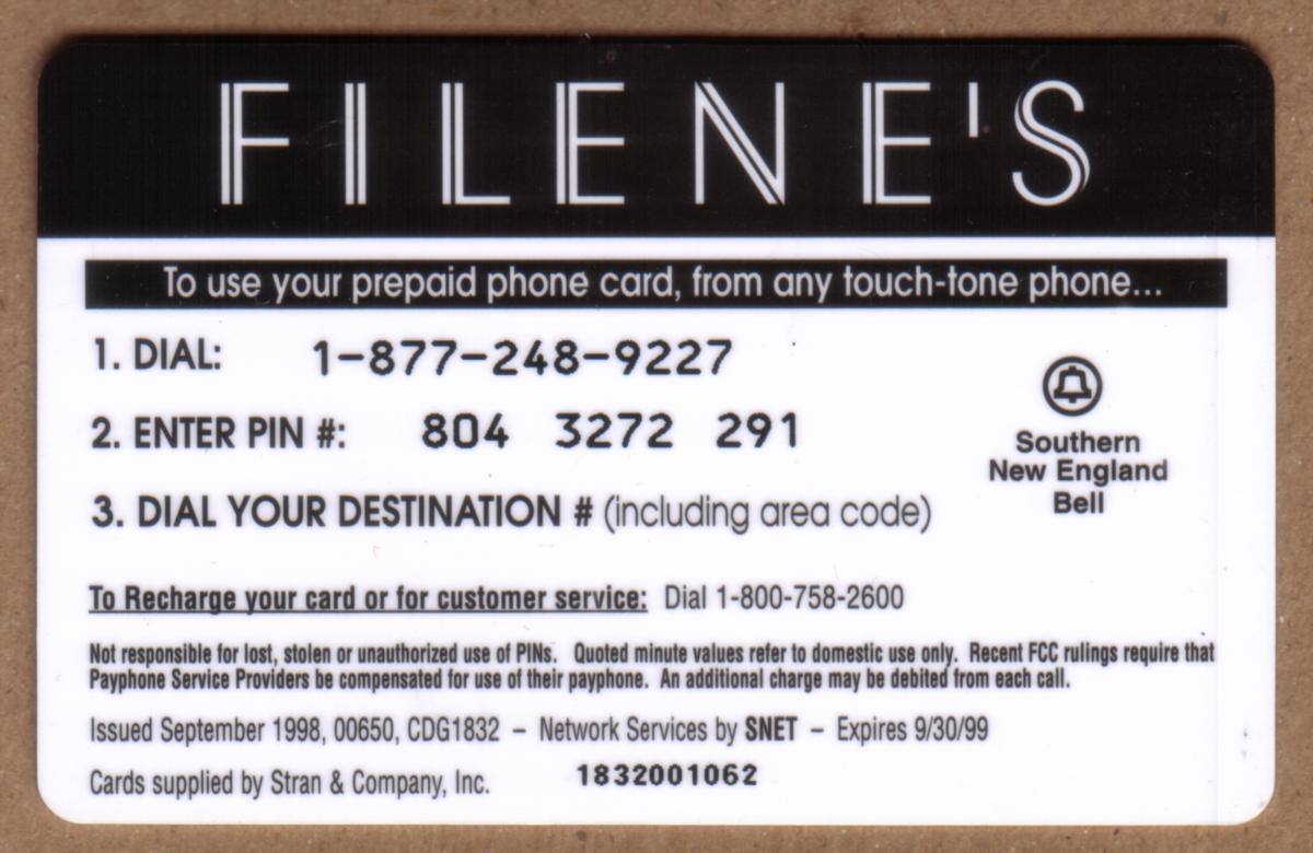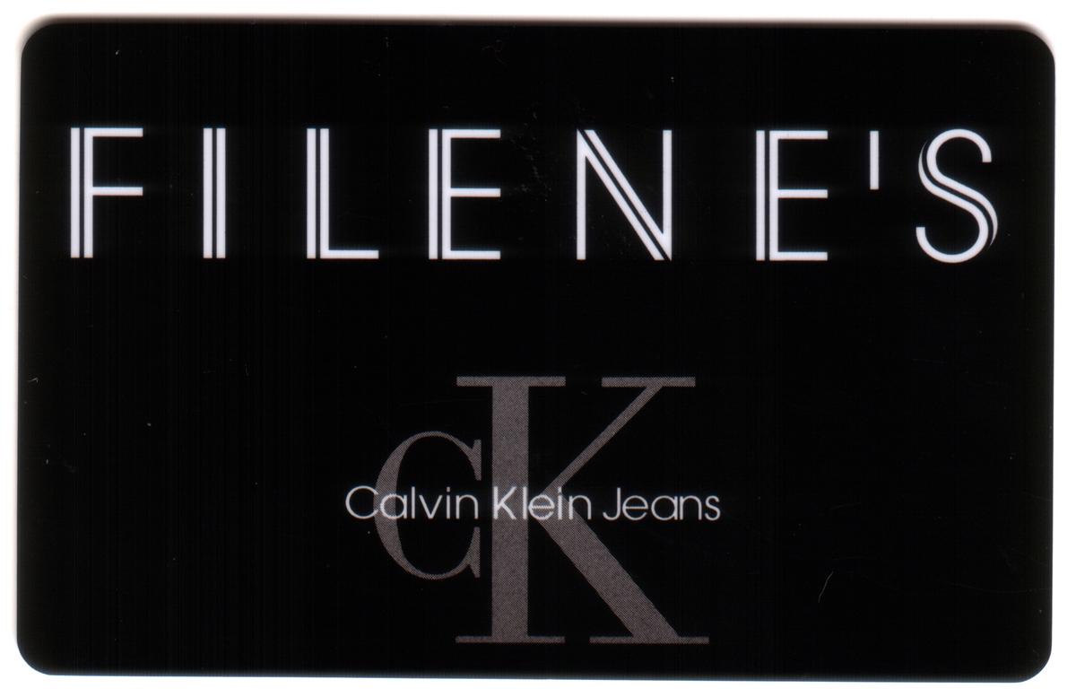 Fashion-themed phone card featuring Calvin Klein Jeans logo and Filene''s branding, combining sleek design with functional telecommunication features. |