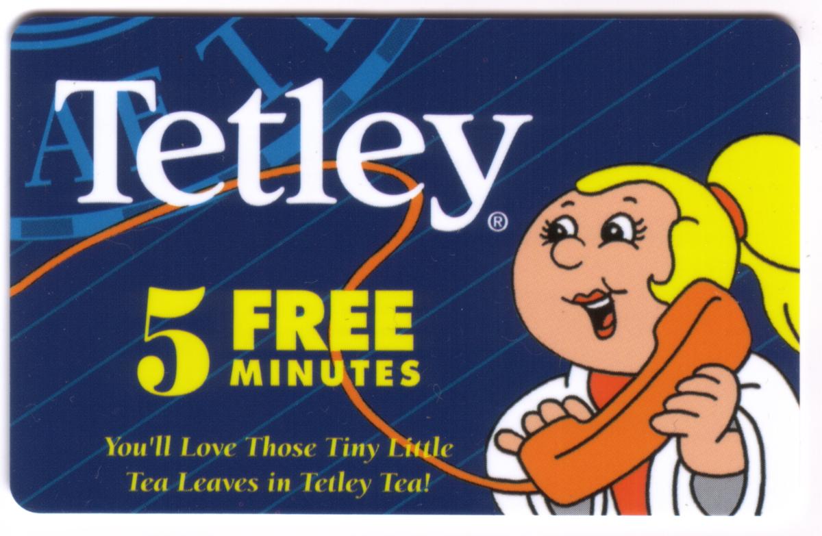 This phone card is promotional in nature, focusing on drinks and showcasing iconic cartoon artwork connecting telephones on phone cards with the Tetley Tea brand. The card clearly displays it as part of a collectible series related to the campaign and promotion involving tea and telecommunication.