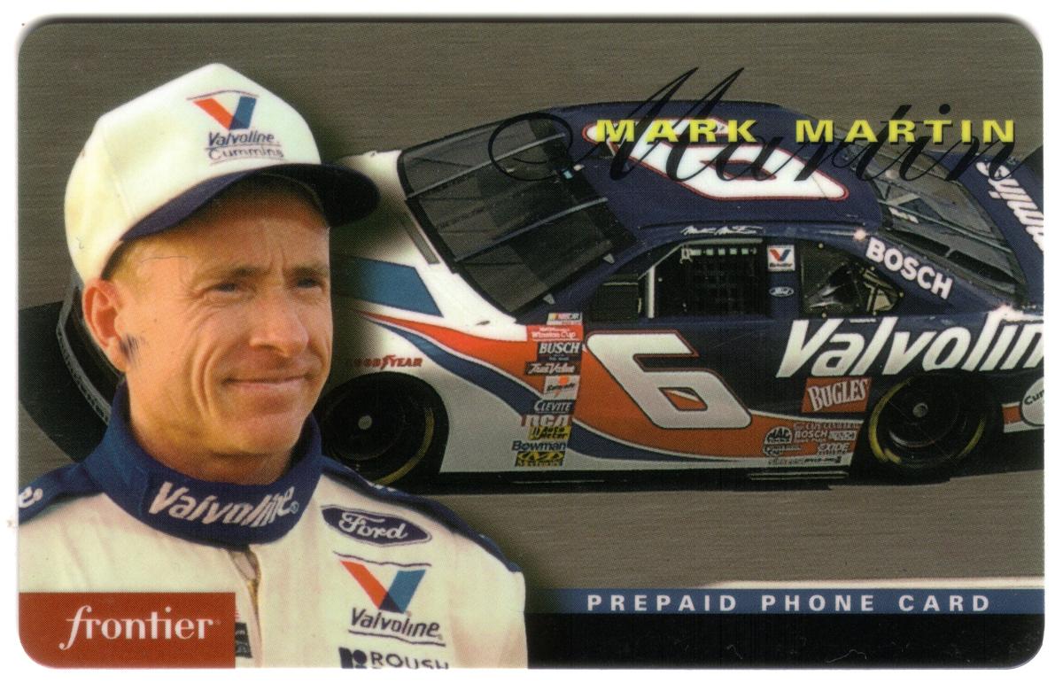 This collectible card features Mark Martin, a well-known figure in auto racing, prominently displayed alongside his #6 Valvoline racing car. The card highlights key sponsors including Bosch, Ford, and Roush, reflecting Martin’s racing affiliations. The racing car is vividly colored, showcasing the Valvoline logo and the number 6 in bold, emphasizing the vehicle’s competitive identity. The background includes text referencing Frontier Communications, indicating another sponsor associated with Mark Martin and his racing team.