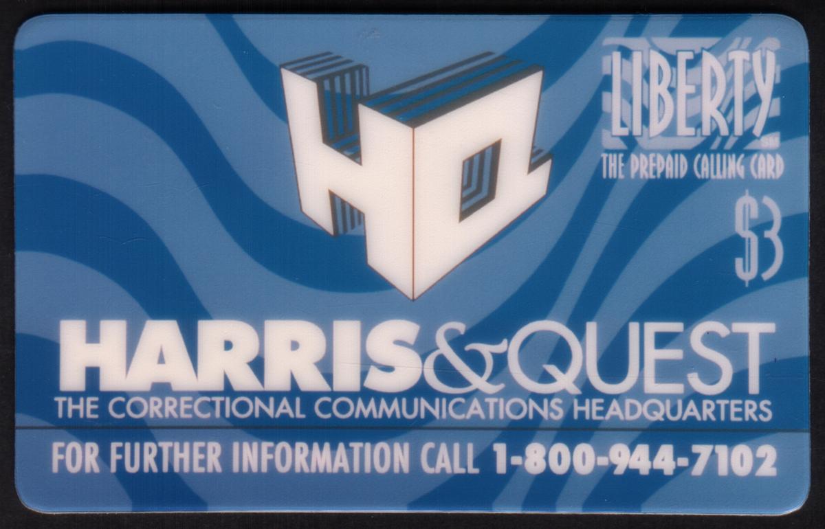 The card displays the numeric value "$3" prominently on the front. The overall layout uses a clean and professional style with corporate branding elements connected to the correctional communications field. The presence of both Harris & Quest Correctional and Quest Group International names highlight its purpose within the correctional IT sector.