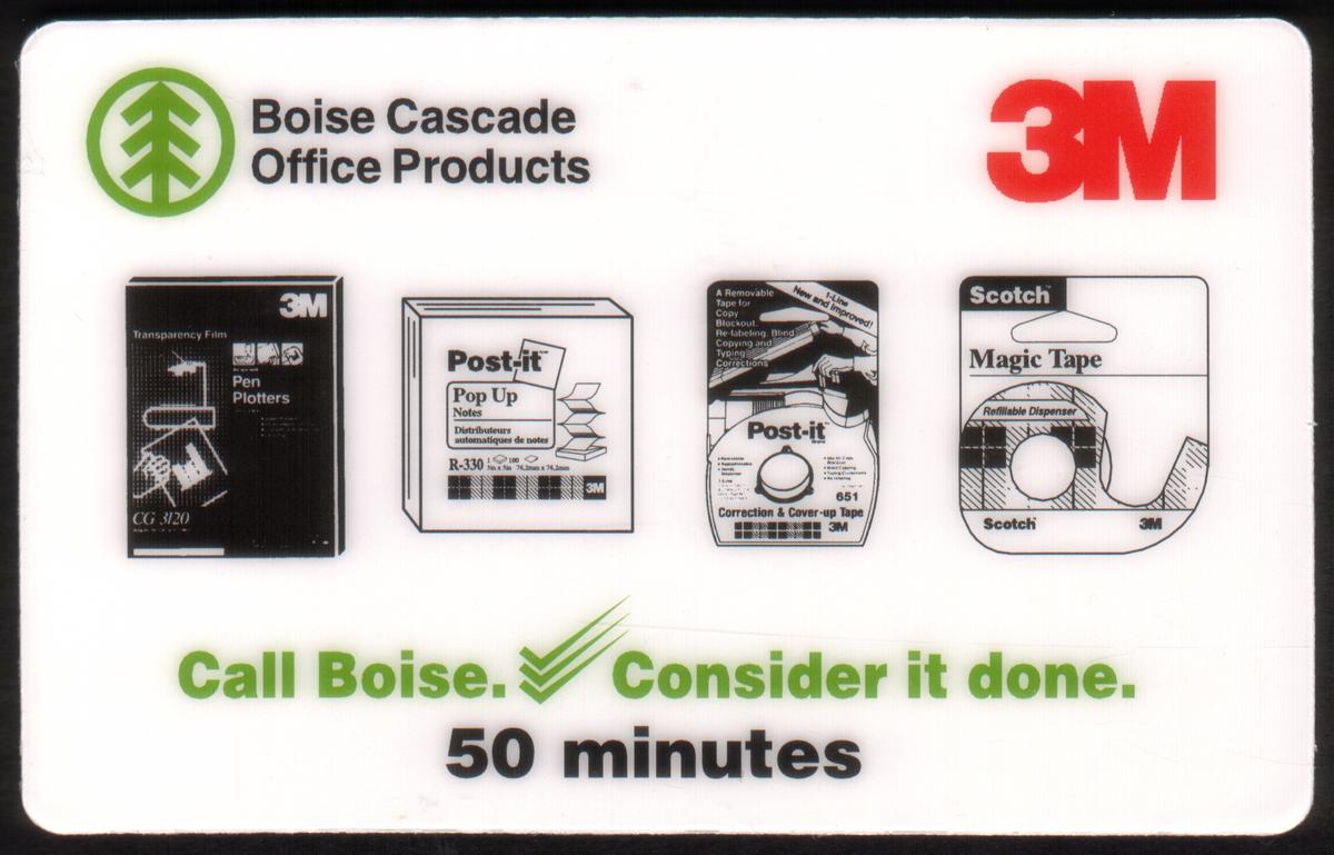 This collectible card serves as a promotional item linking Boise Cascade’s office products and 3M’s popular supplies with major telecommunications companies such as Ameritech and WorldCom. The corporate names and promotional messaging identify its use as a marketing tool related to office products and telecommunications services.