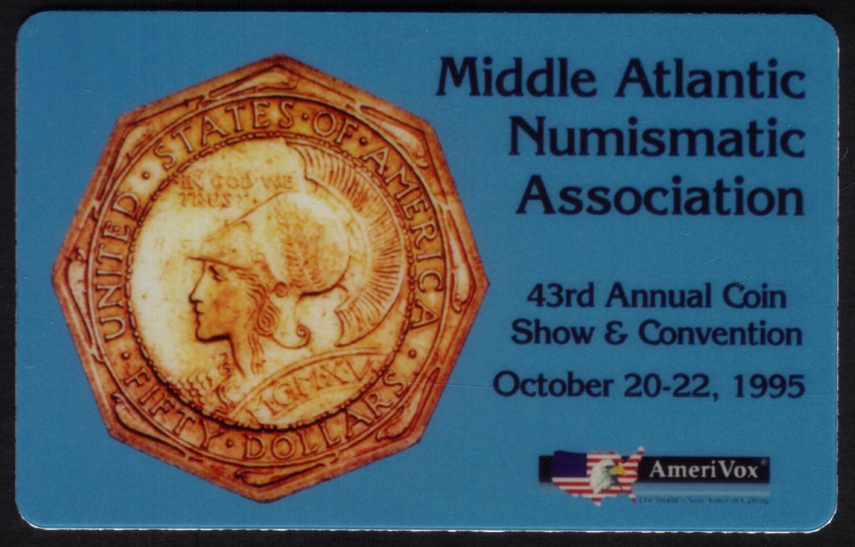 Middle Atlantic Numismatic Association 1995 coin show, featuring a $50 Pan-Pac Gold Octagon coin, U.S. classical figure, and AmeriVox branding. |