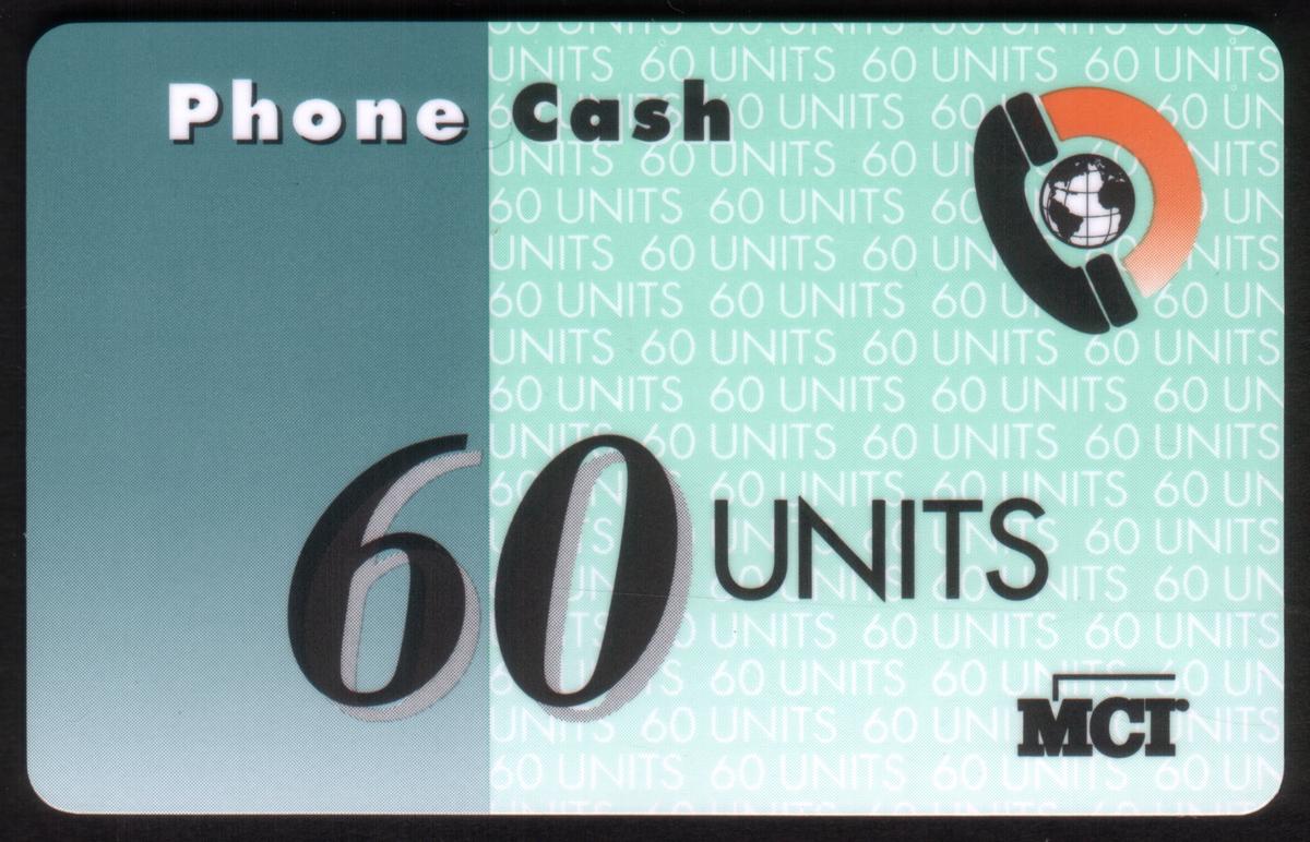 This is a collectible phone card from MCI Communications, representing the value of 60 units (u) of prepaid phone cash. The card is primarily green with clear branding elements including the globe motif and MCI’s identification. It includes Spanish language text, highlighting its use or distribution in Spanish-speaking regions. The card is designed for prepaid phone service, reflecting the telecommunications branding of MCI.