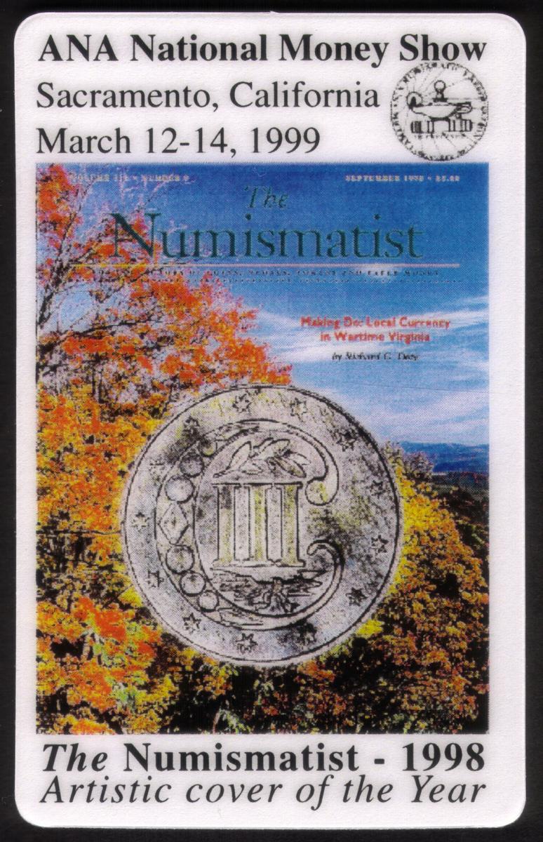 This collectible phone card features the 1998 Artistic Cover of the Year from The Numismatist magazine. The design prominently includes a 3 Cent Silver Coin marked with the word "SAMPLE." The card also highlights the Sacramento, California ANA National Money Show held in March 1999. Tell-One Inc. is indicated on the card, associating it with the phone card’s production or distribution. The overall theme centers on coin collecting, numismatics, and currency, reflecting significant elements important to the world of coin shows and collectors.
