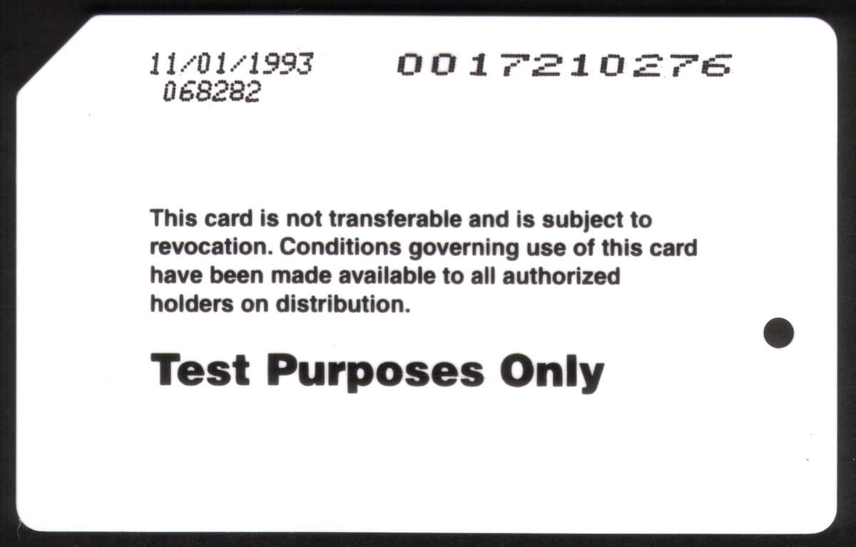 This is a rare MTA test MetroCard issued for use with the New York City Subway system. The card is clearly marked "Test Purposes Only," indicating it was intended for trial or testing rather than public use. The date printed on the card is November 1, 1993, which aligns with early testing phases of the MetroCard system by the Metro Transit Authority of New York City, New York, NY. The card features a serial number "0017210276" and a smaller code "068282" printed near the date.