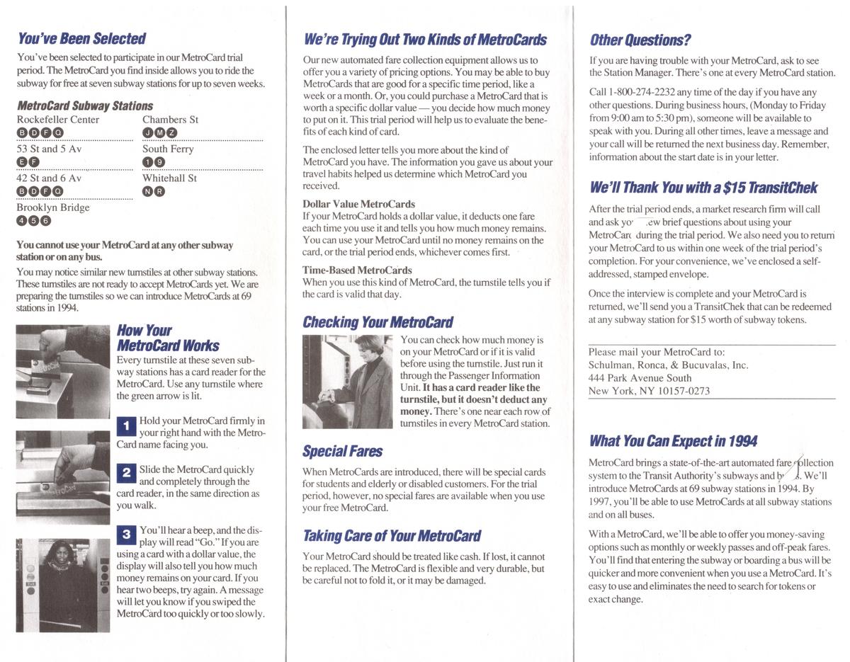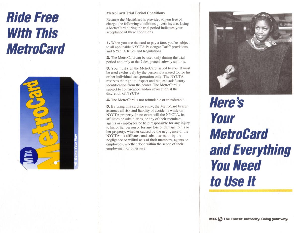 Included with this card is an informative brochure, further emphasizing its purpose as part of a controlled test setup rather than a regular fare medium. This collectible holds significance for those interested in New York City transit history, especially collectors of transportation and subway memorabilia related to early smart card technology.