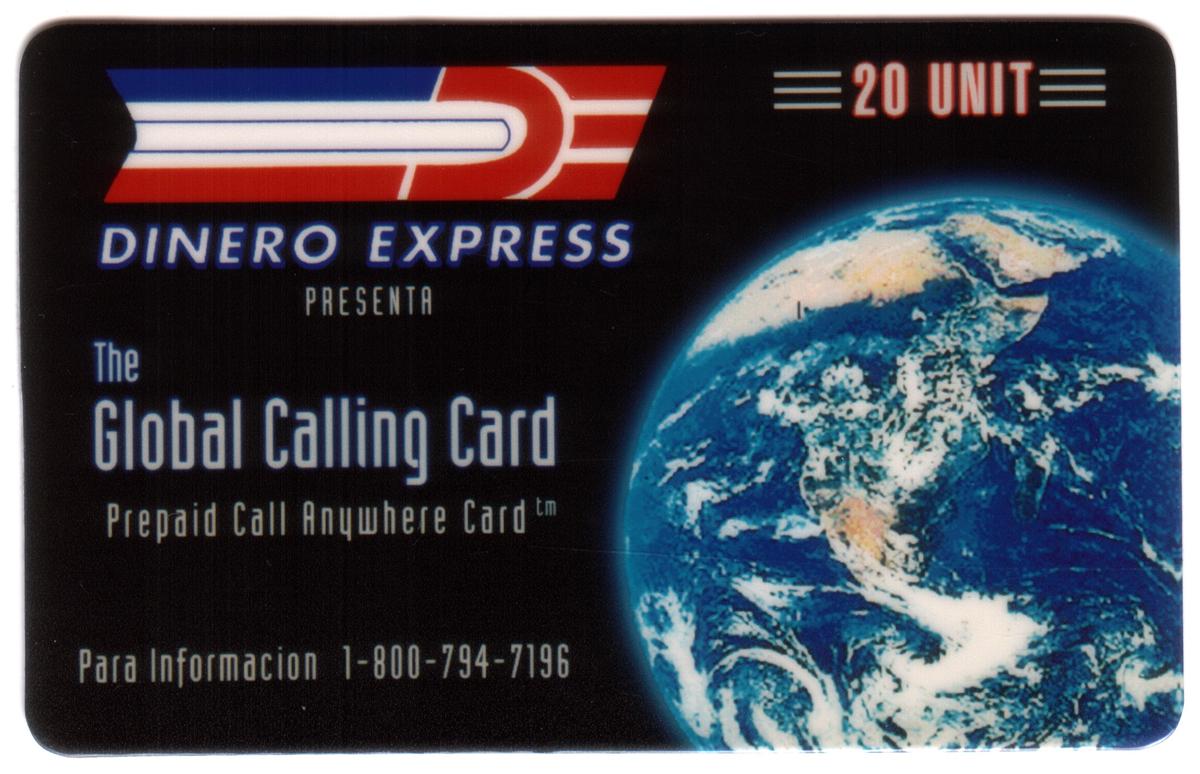 The card includes the name "Dinero Express 20u," indicating its value or units, alongside the branding "Dinero Express" and "Global Tel. Solutions." These elements relate to international calling services. The presence of satellite photographs aligns with the depiction of Earth from orbit, reinforcing the card’s connection to global communication and space technology.