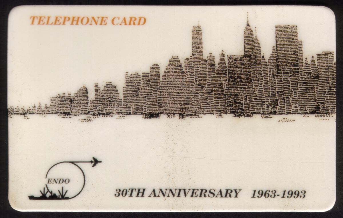 This collectible telephone card commemorates the 30th anniversary of Endo Freight Forwarders Group, covering the years 1963 to 1993. The card's design features a detailed, sepia-toned silhouette of the New York City skyline, with well-defined skyscrapers that capture the city's iconic architectural profile. The artwork spans the upper portion of the card, creating a panoramic view of the metropolis.