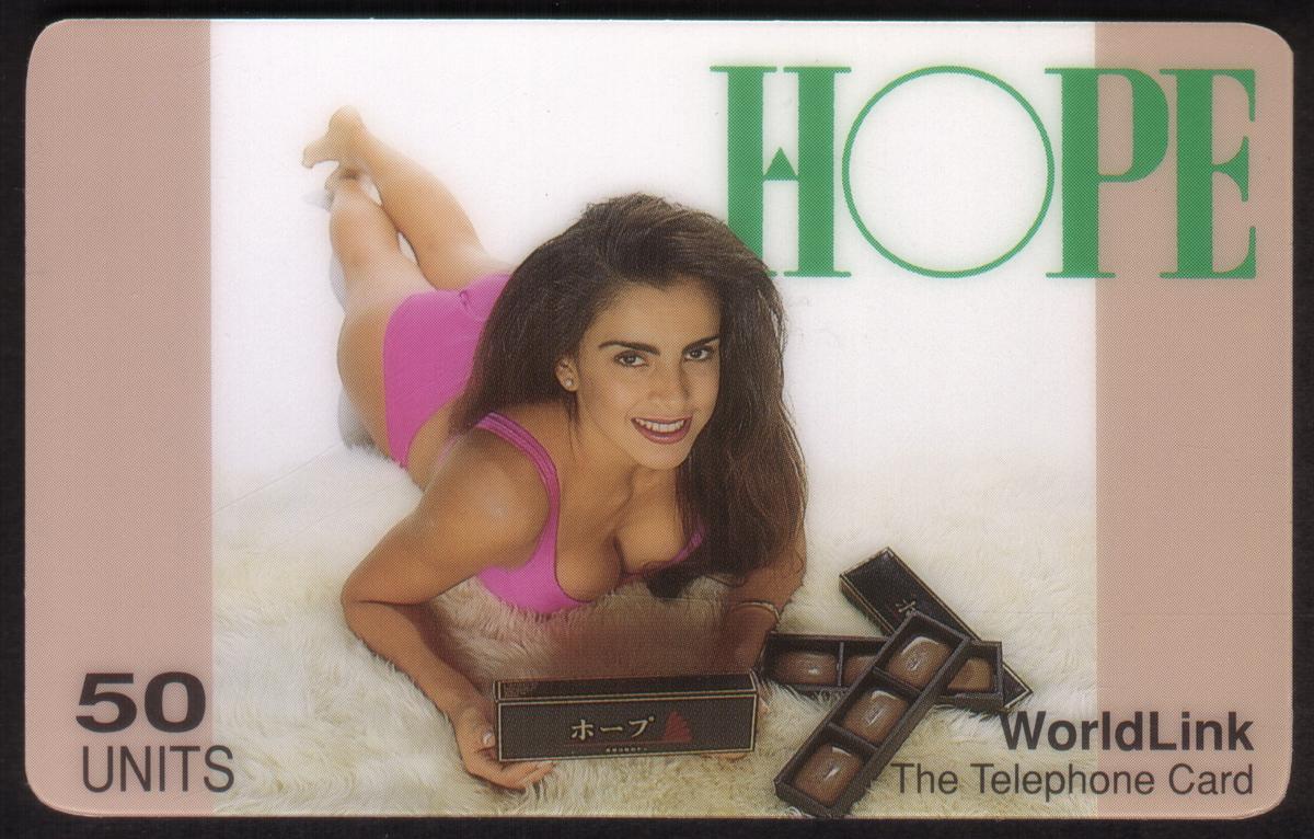 The card includes text elements prominently displaying "50u Hope Soap" with additional descriptors such as "Woman In Swimsuit on Rug Showing Soap Bar Kits" indicating the product being promoted. The logo and trademark information reference WorldLink Communications, indicating the card’s origin or promotional affiliation. The overall presentation ties the themes of bathing, personal hygiene, and household products together with the imagery and branding.