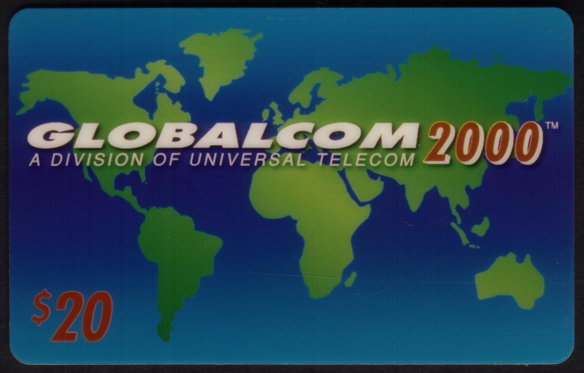At the top right corner, the word "UNIVERSAL TELECOM" appears prominently, accompanied by the Globalcom 2000 logo, which pairs with the map imagery to suggest a global calling or phone service theme. The card clearly states its value of 20 units, reinforcing its use for telecommunication purposes. The overall design merges cartographic elements with corporate branding, creating a collectible piece that reflects telecommunications history and the concept of worldwide connectivity.