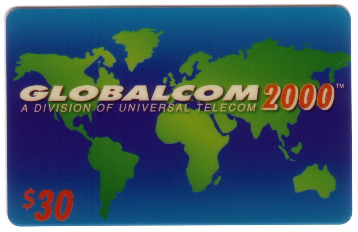 The upper left corner of the card shows a currency value of $30, and the names "Universal Telecom" and "US Tel" appear near the top, indicating telecommunications branding connected with USTEL. The card also includes the "Globalcom 2000" logo and references "ustel" in a clean, modern font style.