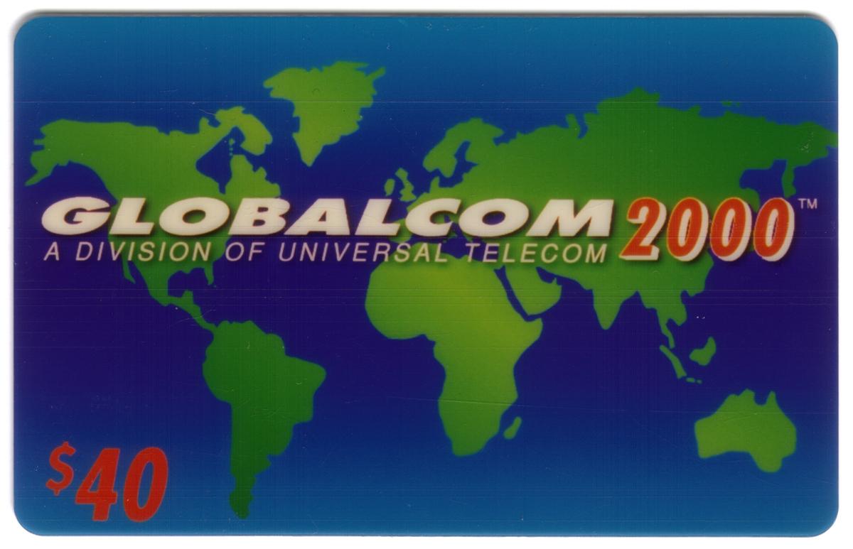 The layout includes a clean, professional font used for the text, with the company name and monetary value positioned clearly to emphasize usability. The map shows continents and countries in a stylized fashion, confirming the global theme of the card. The brand Globalcom 2000 is printed on the card, associating it with international telecommunications services.