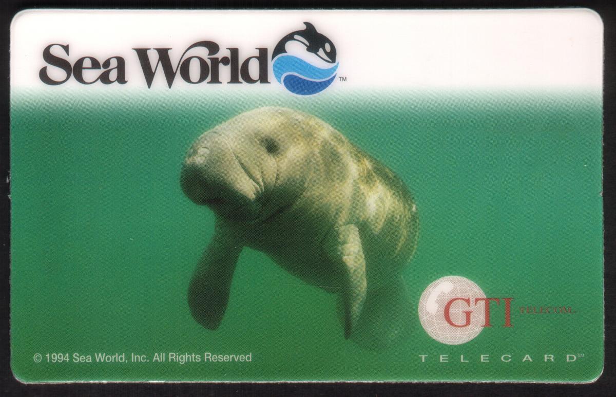 The overall design of the phone card highlights aquatic animals and Florida attractions, specifically focusing on manatees as a sealife species. The photographic quality and layout celebrate marine wildlife commonly associated with travel and sightseeing in Florida, particularly at Sea World Orlando in 1994.
