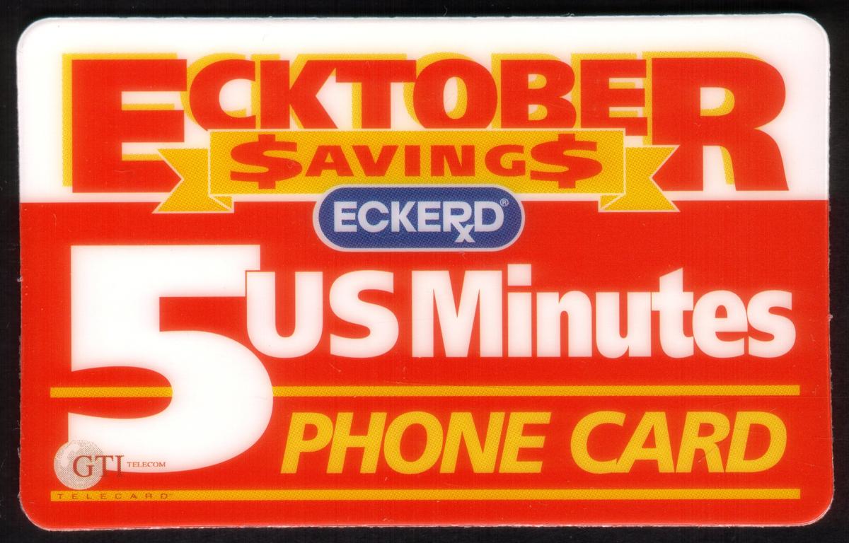 The card does not display a monetary value or number on the front, focusing entirely on its promotional and corporate branding. The overall design conveys a promotional offer centered around Eckerd Drug Store’s "Ecktober Savings" campaign, delivered through a collectible phone card issued by GTI Telecom, Inc.