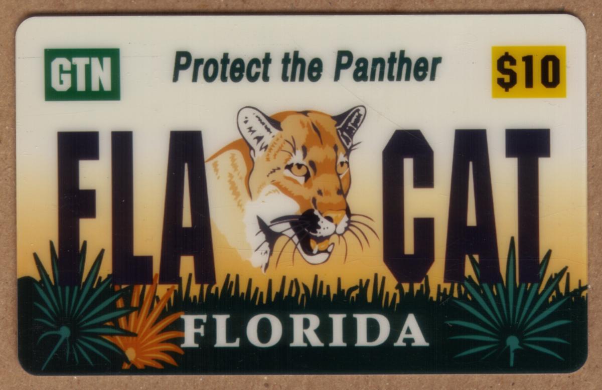 This collectible phone card from Global Telecom Network (GTN) highlights the Florida panther, an endangered species native to the state. The card shows the text "Protect the Panther" prominently at the top, emphasizing conservation efforts. The central design features a detailed illustration of a Florida panther’s face, positioned between the large letters "FLA" and "CAT," which together form the custom license plate text "FLA-CAT." Below the panther and plates is the word "FLORIDA" printed in white against a dark green background with graphic depictions of tropical foliage on either side, reinforcing the card's Florida theme.