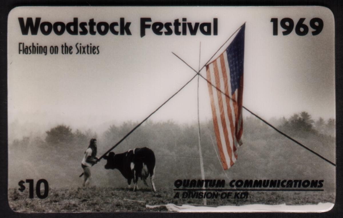 The card is issued by Quantum Communications and carries a value of $10. It was produced in July 1994 under the Division of KDI. The visual composition centers on the outdoor environment of Woodstock, with clear details of the flag and attendees, emphasizing the hippie era and the spirit of the sixties.