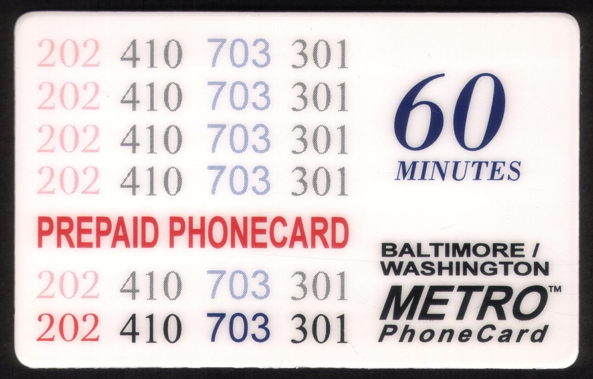 This collectible phone card is titled "Baltimore/Washington METRO PhoneCard" and features a design representing the Baltimore and Washington, D.C. metropolitan area. The card prominently displays the text "Baltimore Maryland" along with "Washington DC" and the metro area code numbers 202, 410, 703, and 301, which correspond to the telephone area codes servicing the region. The card is issued by Cleartel Communications and is valid for 60 minutes of calling time.