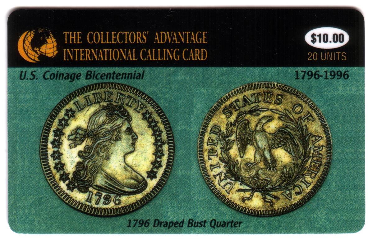 This phone card exemplifies collectible phone cards from the mid-1990s connected to U.S. coinage bicentennial themes. It highlights a significant coin in American history, the 1796 Draped Bust Quarter, emphasizing both historical and collector interest. The card’s design and printed details make it a notable item for collectors focusing on money, currencies, quarters, and American numismatic heritage.