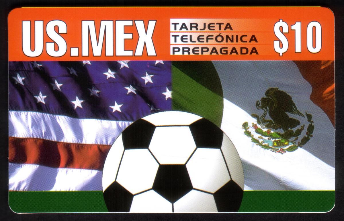 This set of three prepaid telephone cards features a thematic design celebrating soccer and the connection between the United States and Mexico. Each card prominently displays the flags of the United States and Mexico side by side, with a classic black and white soccer ball centered at the bottom, overlapping both flags. The upper portion of each card has a bold orange banner with white block letters reading "US.MEX" on the left.