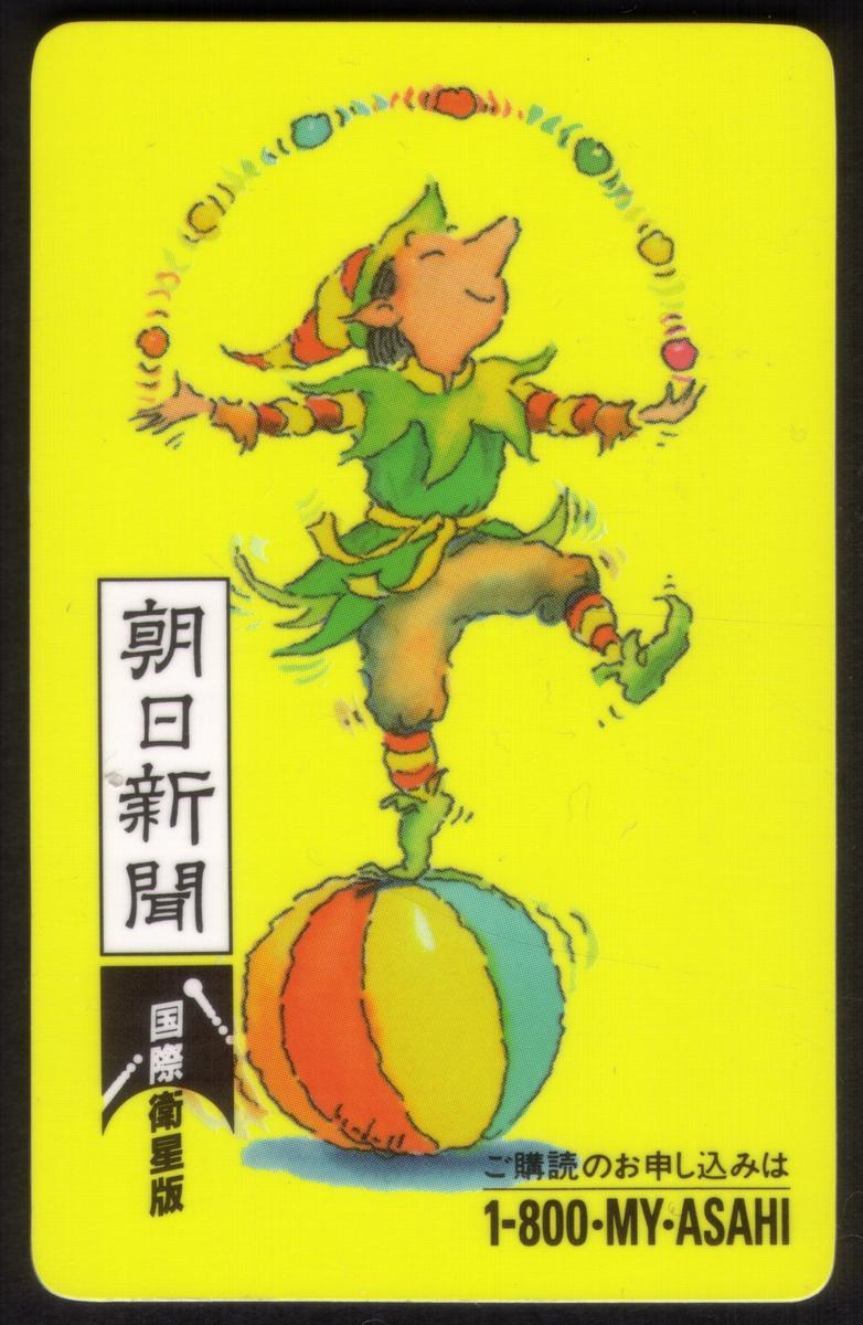 Both cards use vibrant colors to highlight the playful and skillful nature of the juggler character. They are associated with Asahi Corp. and have Japanese writing, indicating their origin in Japan. These cards represent a set of two collectible phone cards linked by the consistent artwork and branding. The denomination information includes $10 and $30.