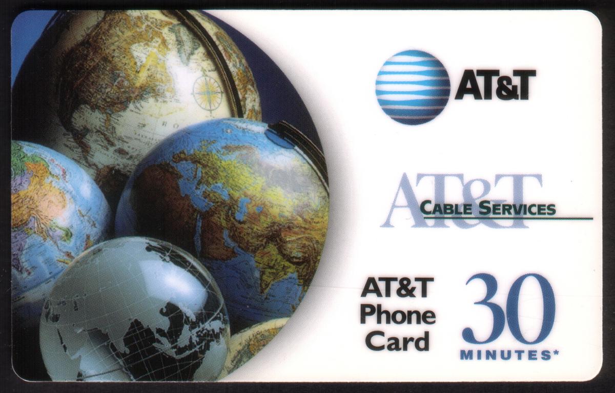 The card’s layout is simple and functional, with the central earth globe drawing attention to the theme of worldwide communication. The text elements provide essential information about the card’s service provider and value without additional decorative elements. The use of the AT&T logo and the specified value clearly identify the card’s purpose for telecommunications. The card belongs to the world globes theme and is associated with AT&T’s cable services branding, reinforcing the company’s connection to global telecommunications infrastructure.