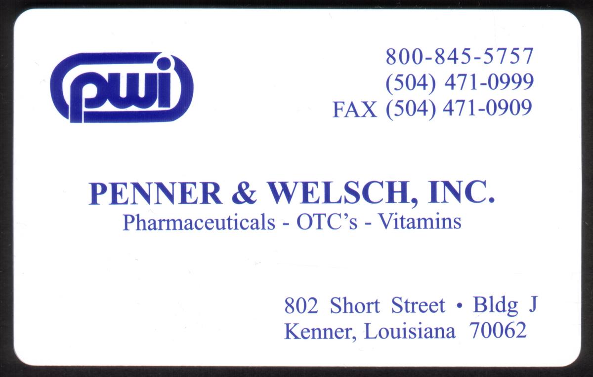 No personal names or additional graphics appear on the card besides the details mentioned. The card’s design is clean and professional, emphasizing its commercial and pharmaceutical context connected to Kenner, Louisiana, and the associated drug brokers and pharmaceutical company identified on the card.