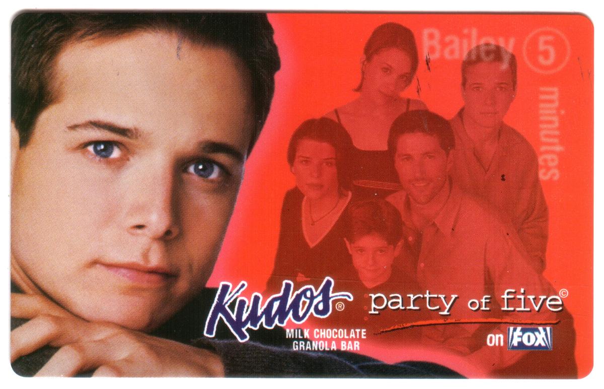 Overall, the phone card serves as a collectible item combining television entertainment with branded marketing, showcasing Bailey Salinger from "Party of Five," Scott Wolf's image, and the Kudos product branding. The Fox series and responsible corporate entities Mars Incorporated and Columbia Pictures Television are clearly identified.