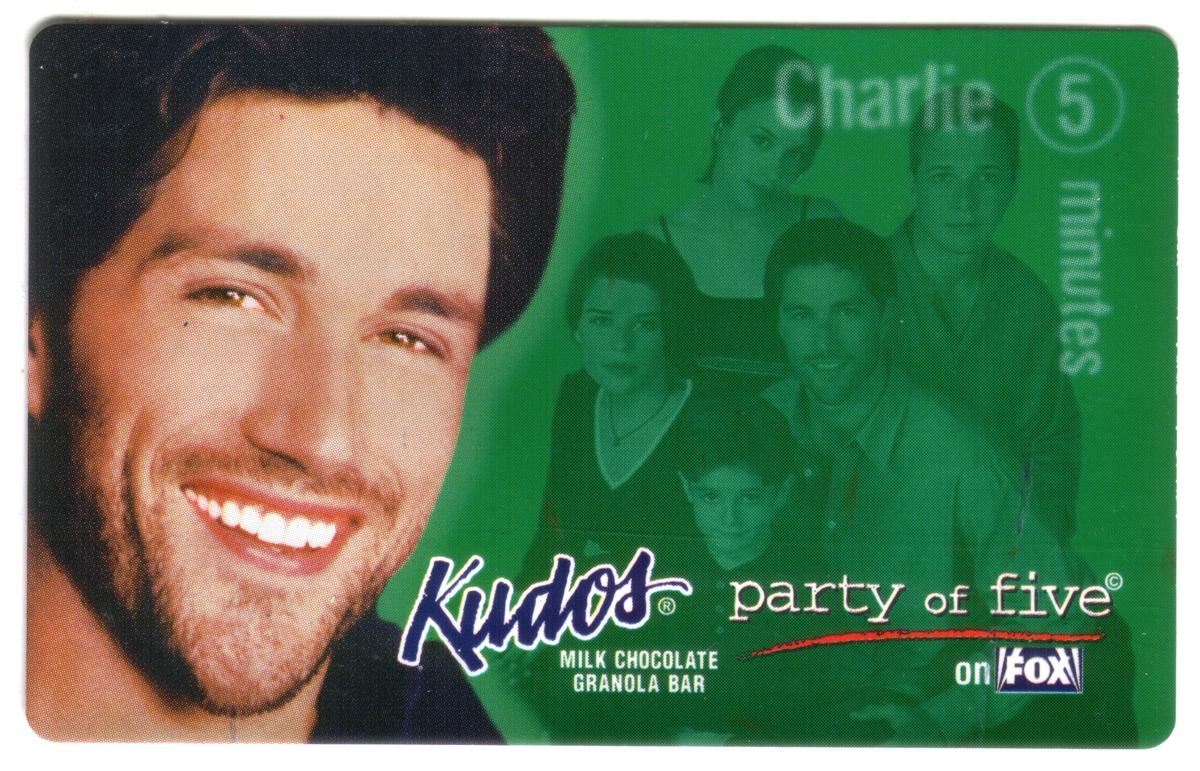 The bottom portion of the card includes branding for Kudos Milk Chocolate Granola Bar. The logo for Fox Television is positioned in the corner, emphasizing the card’s connection to the TV series. The overall design captures a promotional collaboration tied to *Party of Five* and its television cast member, Charley Salinger.