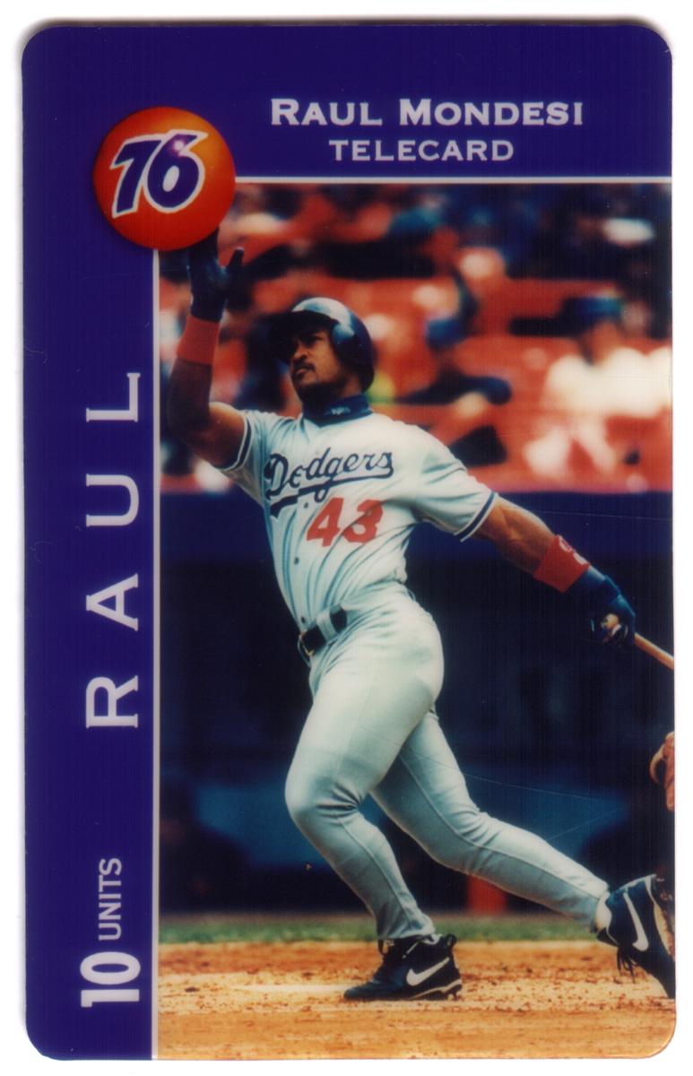 This telecard combines elements of sports memorabilia with corporate branding through the inclusion of the Dodgers logo and the Unocal 76 service station emblem. It is a collectible phone card that reflects both baseball and corporate sponsorship from the era when Raul Mondesi played professionally for the Dodgers.