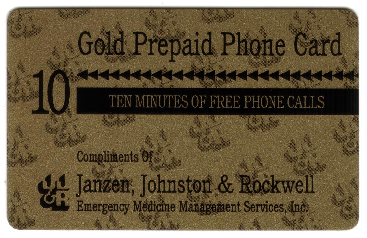 This collectible gold prepaid phone card features prominent corporate logos and trademarks associated with Emergency Medicine Management Services Inc. The front of the card displays the company name "Emergency Medicine Management Services Inc" along with "Medical Services 10m JJ&R." The combined branding of Janzen, Johnston & Rockwell Emergency Medicine Management is clearly visible, indicating the company’s involvement in emergency medical communications. The phrase "Communications Design" is also present, linking the card to the communications aspect of the services offered.