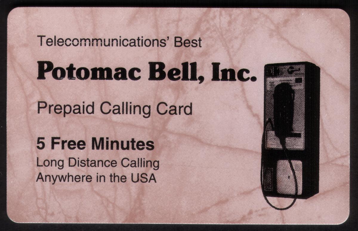 The overall design showcases the telephone as a functional and iconic object in communications history, aligning with Potomac Bell Inc.’s reputation in the telecommunications industry. The colors and layout combine to highlight the theme of payphones and public telephony during the era when collectible phone cards were widely used.