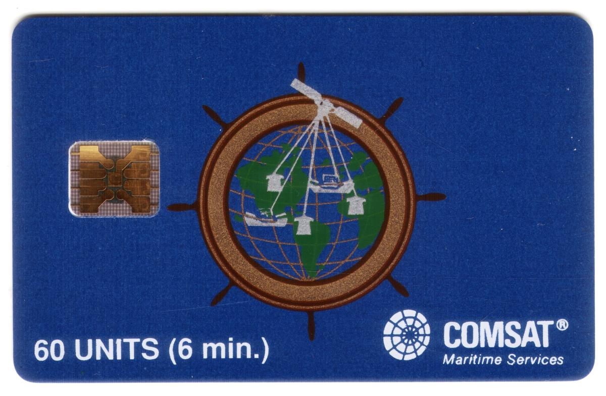 Maritime satellite communication phone card featuring Earth, ship’s wheel, satellite dishes, and COMSAT logo for global ship-to-shore connectivity. |