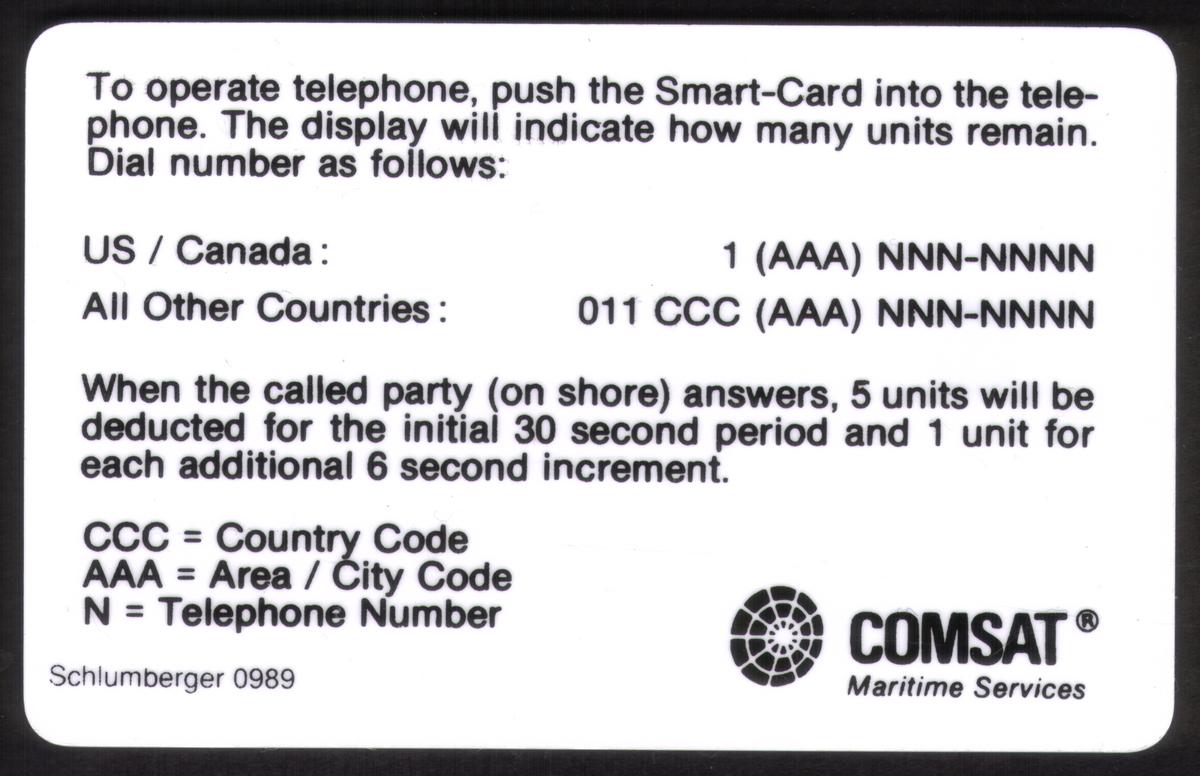 Keywords: setof, world globe, satellite, telephones, chip card, ships, svc, stored value, smart card, ocean, chip sc-4 gold, COMSAT Mobile Comm.