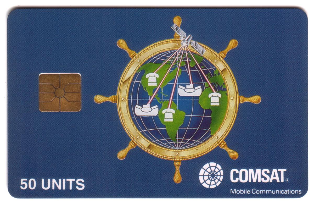 The background of the card is a solid deep blue, providing contrast to the central graphic elements. In the lower-left corner, the card shows the denomination "50 UNITS" in bold white text. The bottom right corner holds the COMSAT logo, which includes a circular design next to the text "COMSAT" and the phrase "Mobile Communications" printed beneath it. The card also contains an embedded gold chip to the left side, consistent with its function as a stored value smart chip card.