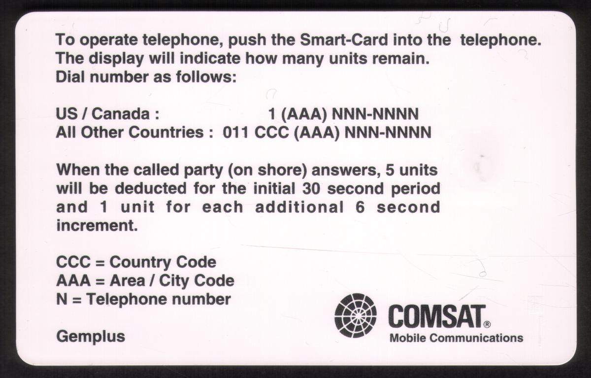 This chip card is associated with COMSAT and relates to satellite ship-to-shore communication, reflecting a theme of global telecommunications. It connects elements such as world globe, satellite, telephones, ships, ocean, stored value, smart card, and Gemplus Gold Chip technology in a cohesive design.