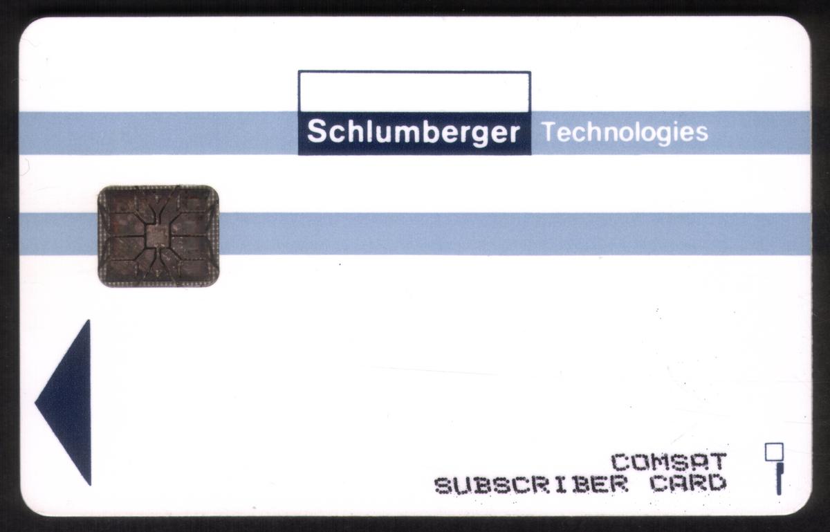 Prominently featured on the card are the names COMSAT and Schlumberger, establishing the card’s connection to major telecommunications entities. This card serves as a stored value card designed for mobile or fixed communication access and is intended for use specifically with the Comsat network infrastructure.