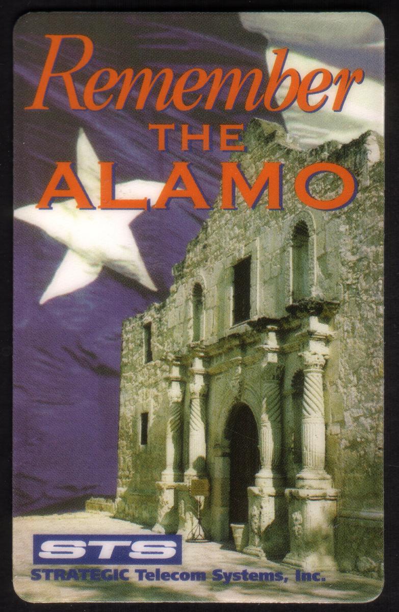 The card bears the text "Remember The Alamo" in clear lettering, emphasizing the historical importance of this site. The Texas star is rendered in red, white, and blue, colors associated with both Texas and the United States, symbolizing patriotism and the struggle for independence. In the lower right corner, the card credits “Strategic Telecom Sys.,” indicating the issuer or distributor of the phone card.