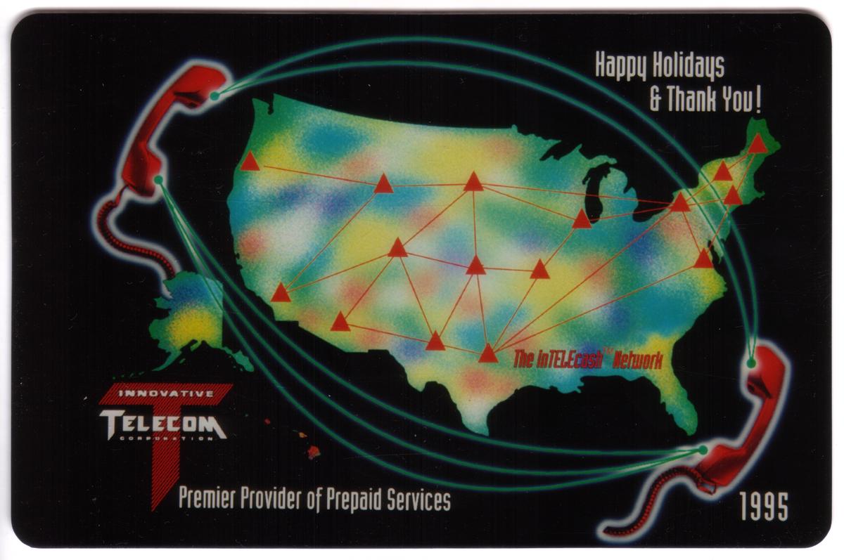 At the top center of the card is the phrase "Happy Holidays & Thank You" written in bold red and green lettering, emphasizing a seasonal and appreciative message from the card issuer. The year 1995 is also printed near this greeting, indicating the time of issue or promotion. In the lower-left area, the words "Innovative Telecom" appear, identifying the company or brand associated with this phone card.