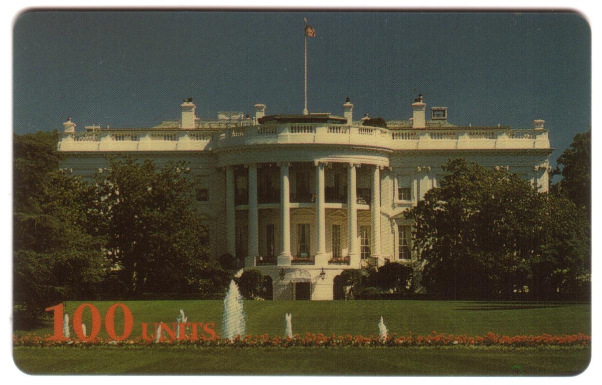 This card is a collectible phone card and uses a chip embedded within the card’s surface for telecommunications purposes. The design and branding confirm its intended use while commemorating the White House as a historic U.S. political site. The overall presentation balances a clear image of the White House with relevant informational text and corporate branding.
