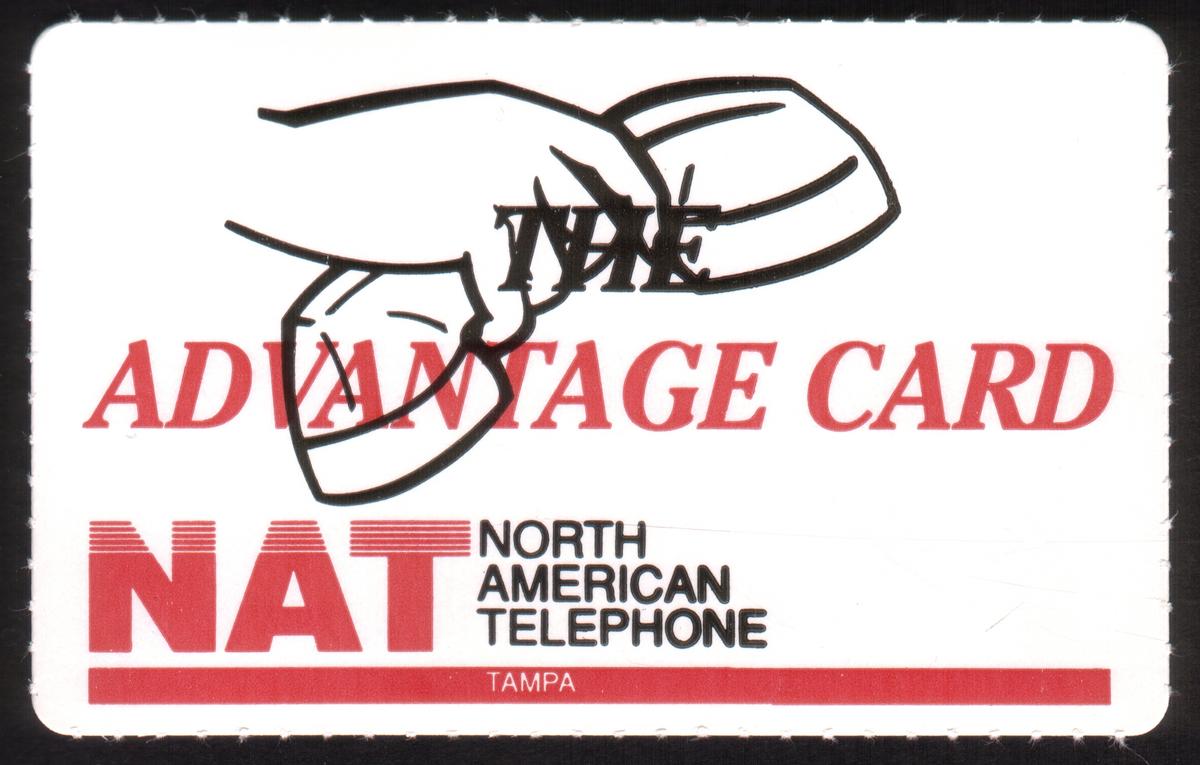 This collectible card is a North American Telephone user card issued in Tampa, Florida. It carries a face value of $5.00 and is titled "THE ADVANTAGE CARD." This card is part of the First Series, which was initially issued in November 1992. The design features a black line drawing of a hand holding a telephone handset positioned above the red text "THE ADVANTAGE CARD." Below this, the initials "NAT" appear in large, bold red letters, with the words "NORTH AMERICAN TELEPHONE" stacked in black text to the right of the initials. At the bottom, a red horizontal bar contains the word "TAMPA" in small white letters.