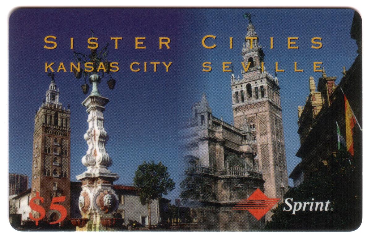 The card is marked with a $5 value in orange on the lower left corner, alongside gold text at the top reading "SISTER CITIES KANSAS CITY SEVILLE." The Sprint logo appears in white and red on the lower right corner. Keywords associated with this card include sightseeing, architecture, tourism, Kansas City KS, Kansas, Seville Spain, Spanish Cities, United States, city gates, Germany, $5, and Sister Cities: Kansas City & Seville.