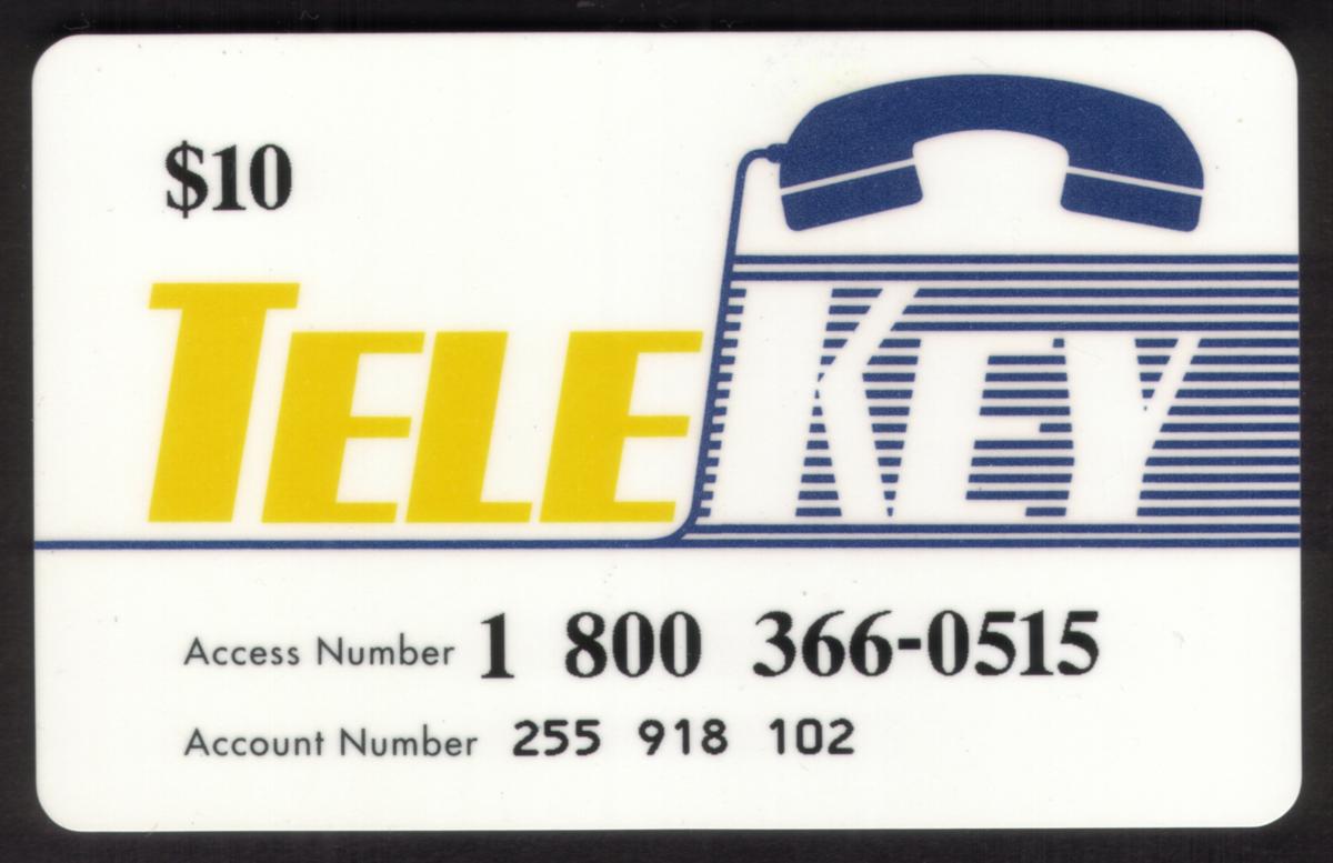 This collectible TeleKey phone card has a $10 value and prominently features the TeleKey logo in bold yellow and blue lettering. The word "TELE" is printed in bright yellow, while "KEY" is depicted in white with blue horizontal lines running through it, set against a blue telephone handset icon above the text. The design is clean and straightforward, emphasizing the branding and functional details.
