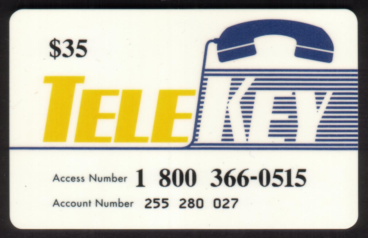 This collectible TeleKey card has a $35 value and prominently features "TeleKey" in large letters across the front. The text "Tele" is in bold yellow, while "KEY" is in blue with horizontal lines. Above the word "KEY" is a dark blue graphic of a classic telephone handset.