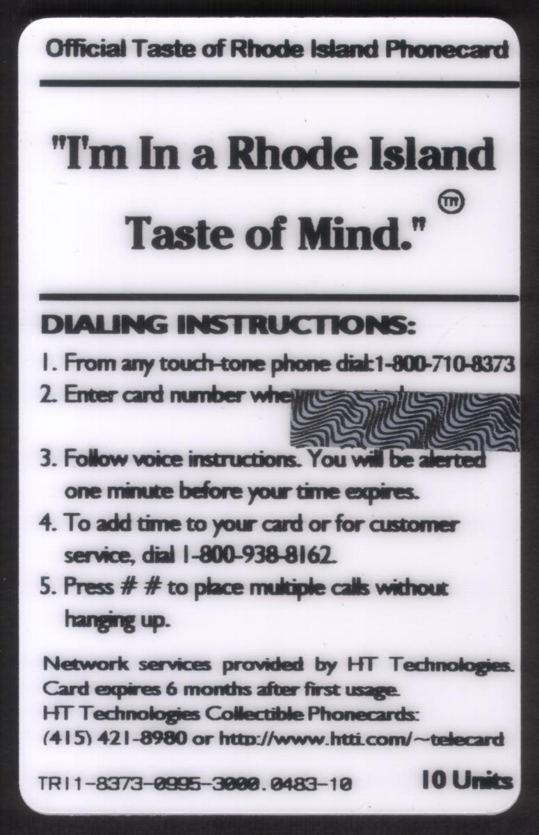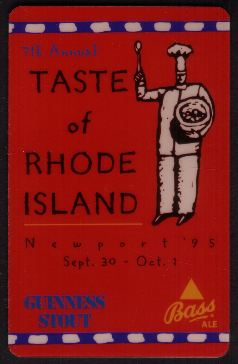 This card is related to the "I'm in a Rhode Island Taste of Mind 10u 7th Taste of Rhode Island Newport '95" promotion and is produced by HT Technologies. It visually and textually celebrates the food and beverage culture of Rhode Island through its event branding and sponsor logos.
