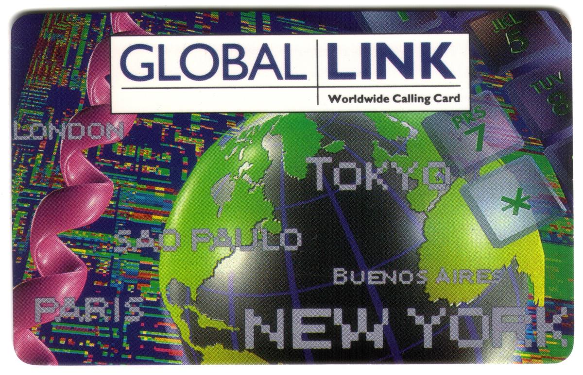 Global Link international calling card featuring a digital globe, city names like Tokyo and New York, and a futuristic design for worldwide communication. |