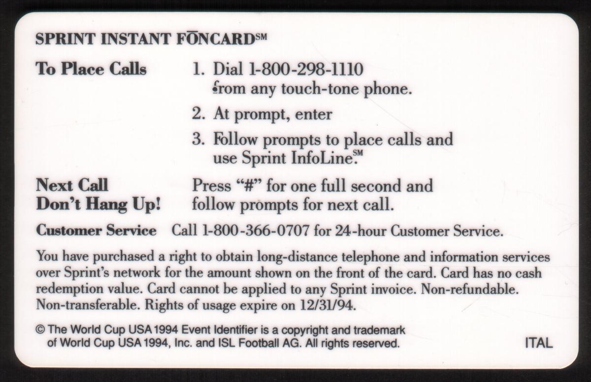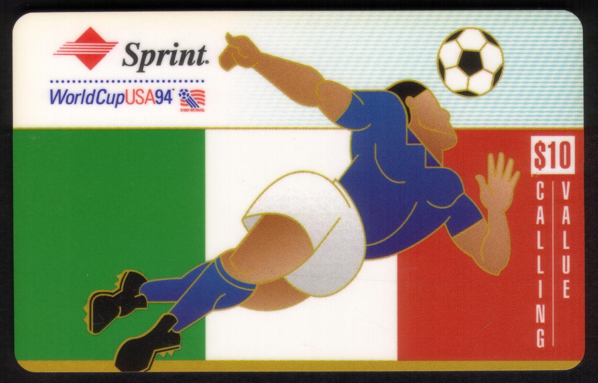 This collectible phone card is a specimen issued by Sprint related to the World Cup 1994 soccer event, featuring artistic representations of soccer and international elements like the Italian flag and soccer balls. The card serves both as a functional calling card and a sports memorabilia item celebrating the World Cup and Italy’s role in the event.