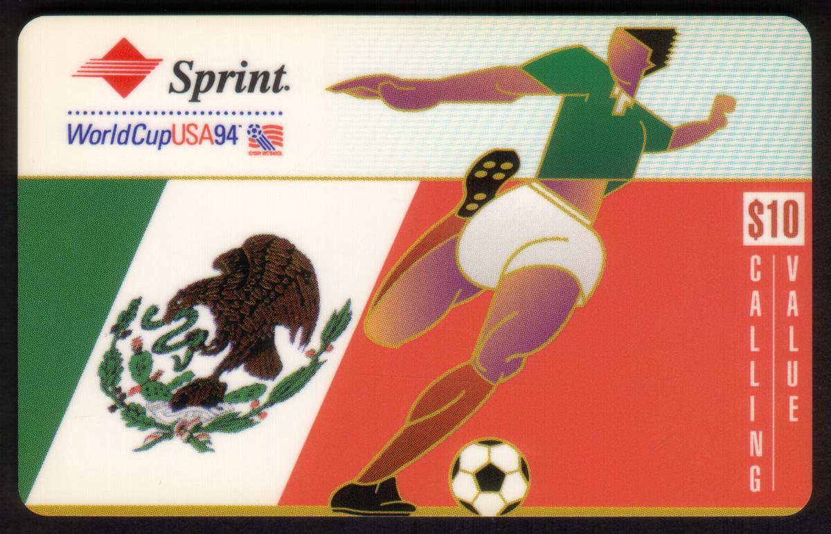 Additional smaller text at the bottom left corner notes the value as "$10," suggesting the card’s denomination or use value related to telecommunications. The overall design includes artistic renderings that combine drawings, paintings, and international soccer motifs, resonating with fans of soccer and collectors of memorabilia from the 1994 World Cup. The use of international flags, soccer balls, and the Mexican national symbols highlights Mexico’s participation in the tournament.
